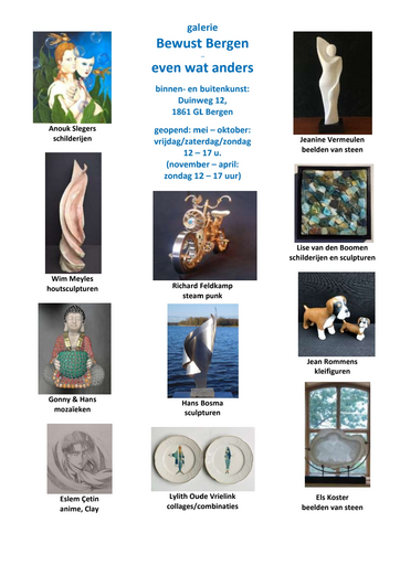 De buitenexpositie in de beeldentuin van galerie bewust bergen, duinweg 12 1861 GL Bergen 01-06-2024 tot 01-11-2024. vrijdag,zaterdag en zondag van 12-17 uur.