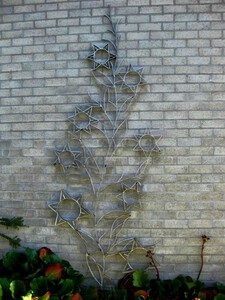 2012boemenrek gemaakt van rvs plat 30x3. Acht bloemen zijn er in verwerkt. Een blikvanger tegen de gevel.