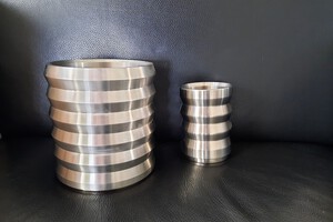 20152 zwaar uitgevoerde rvs potten. 1 pot Ø 170x180 gew.8 kg en 1 pot Ø 100x130 gew.2 kg. Fraai bewerkt en zwaar uitgevoerd.